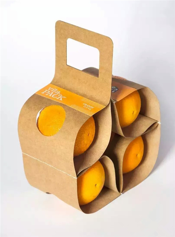這款橙子包裝是一款手提袋式的包裝造型,因為牛皮紙的纖維是長纖維,因此牛皮紙拉力耐破度較強,不用擔(dān)心手提袋因負重多大而損壞。每個擺放橙子的格間都有一個圓形的天窗,這樣能將橙子固定住,避免橙子在移動運輸過程中掉落,更好的保護產(chǎn)品。