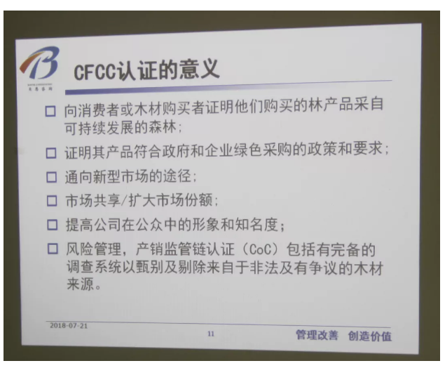 伽立實業(yè)集團(tuán)邀請來自專業(yè)機(jī)構(gòu)的培訓(xùn)講師,任職PEFC和CFCC認(rèn)證相關(guān)崗位長達(dá)數(shù)十年經(jīng)驗,對營銷中心及相關(guān)部門進(jìn)行PEFC和CFCC認(rèn)證培訓(xùn)指導(dǎo)。